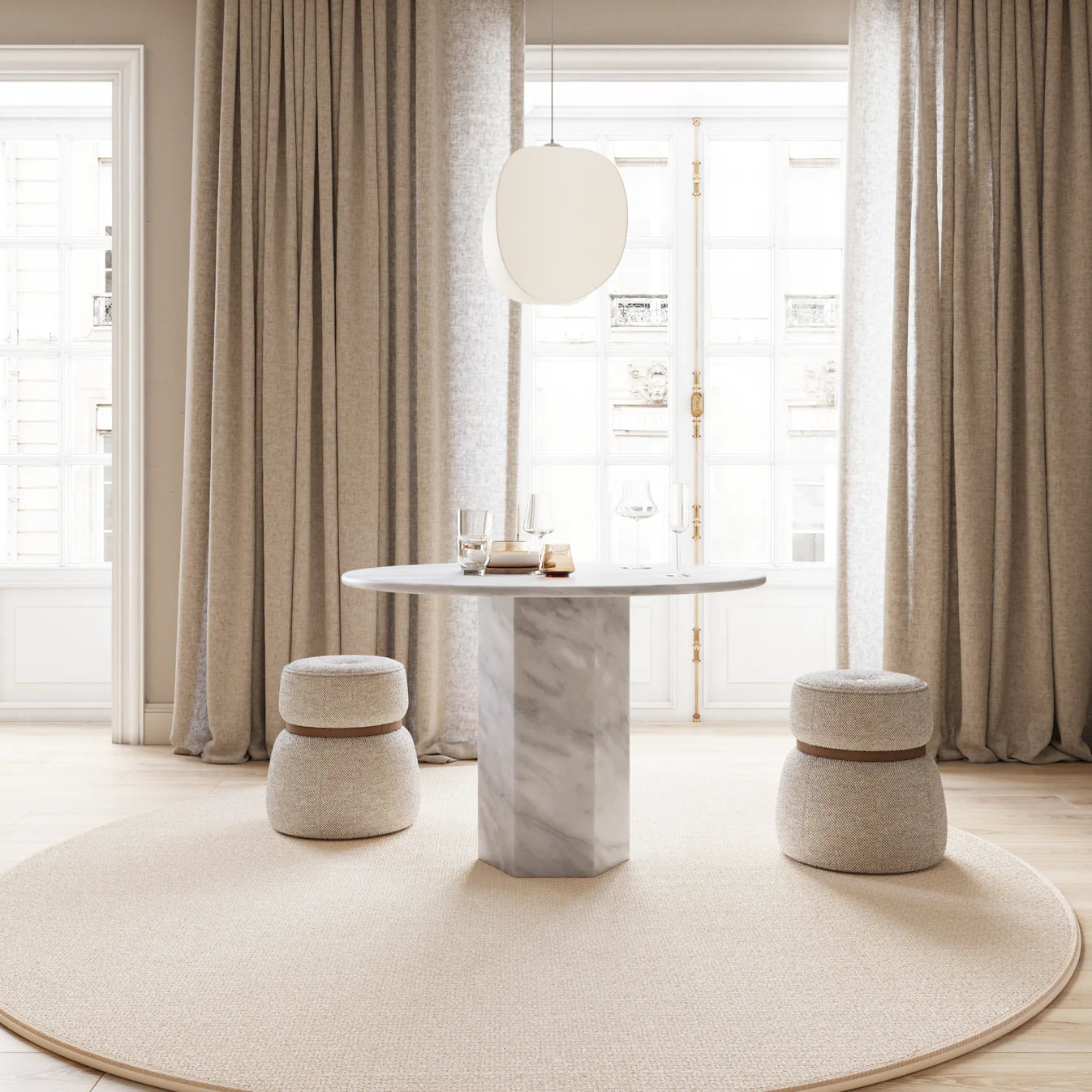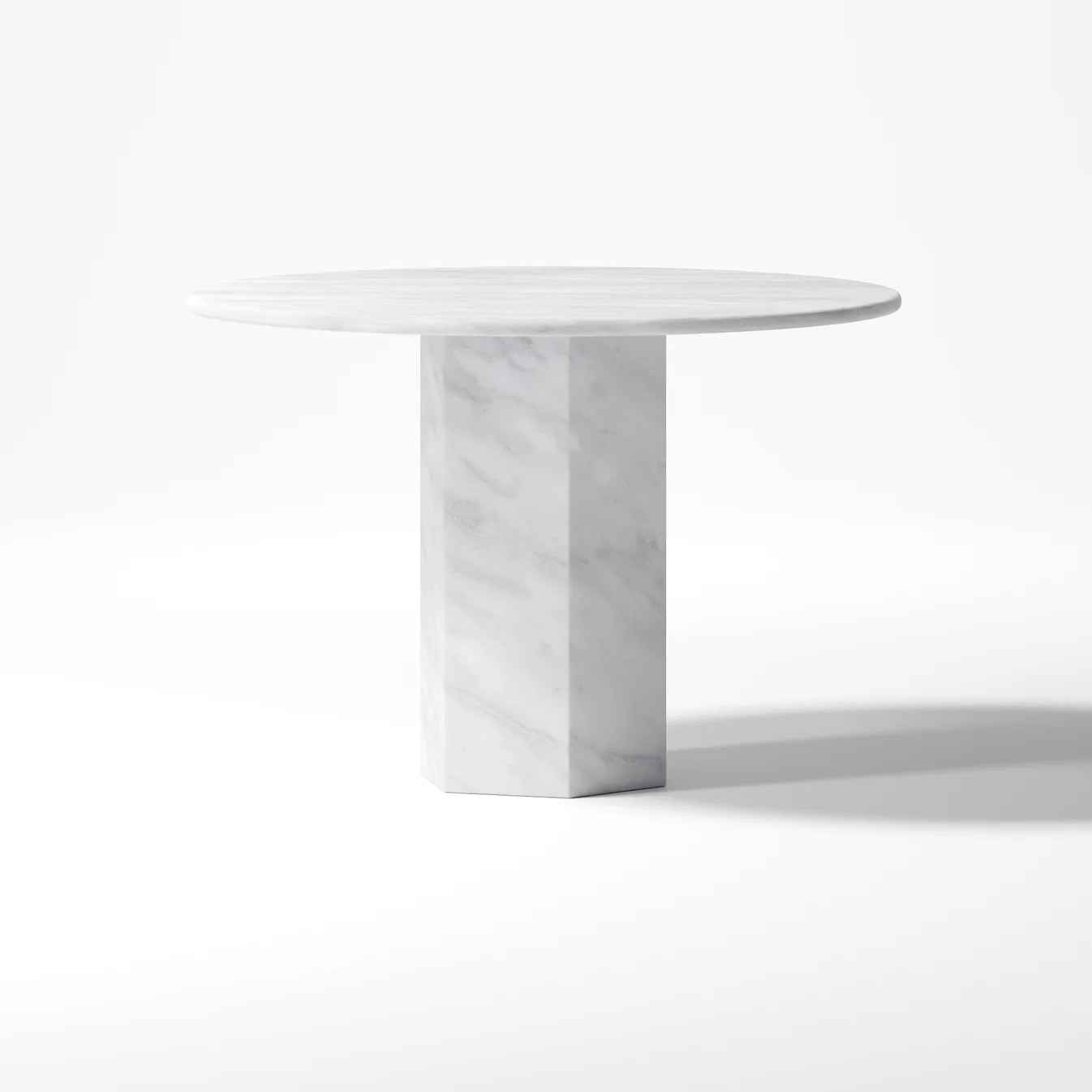 Contemporary yet enduring, the Axiom Dining Table is a bold expression of form and functionality. A round tabletop in Travertine or Marble rests on a distinctive hexagonal base—offering geometric elegance with a refined presence.
