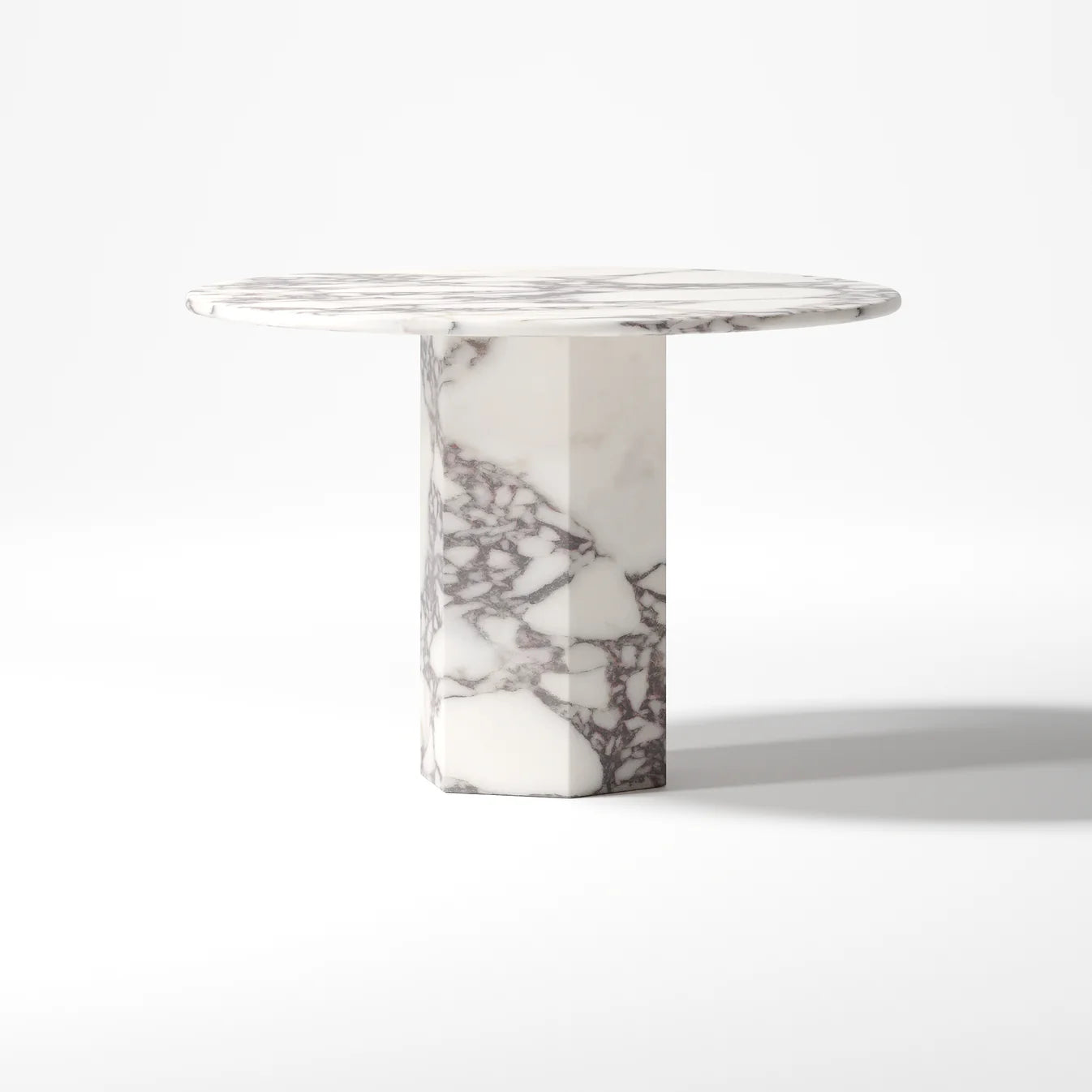 Contemporary yet enduring, the Axiom Dining Table is a bold expression of form and functionality. A round tabletop in Travertine or Marble rests on a distinctive hexagonal base—offering geometric elegance with a refined presence.