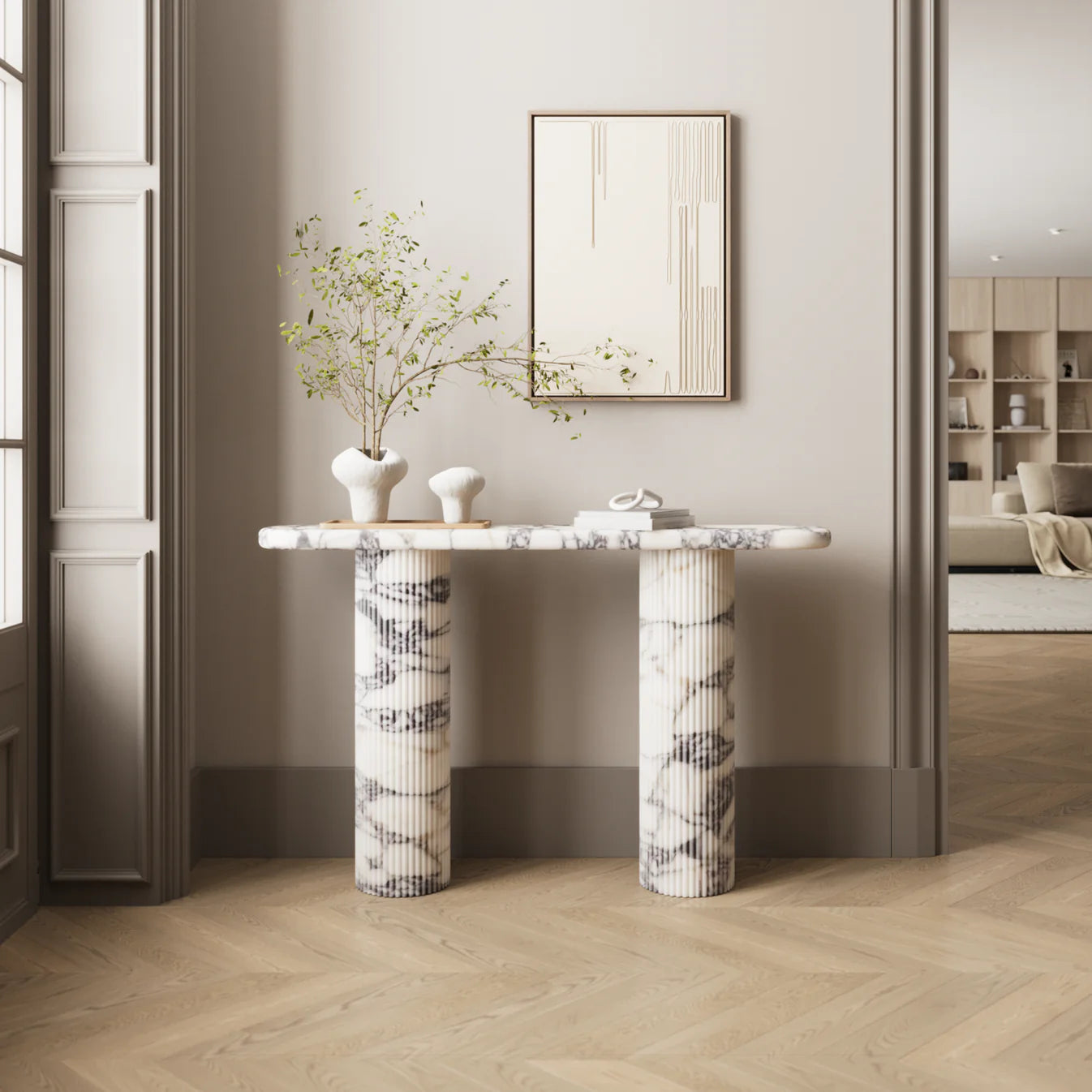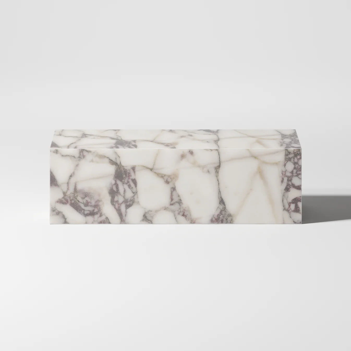 Its sleek, sculptural form is crafted using 2cm mitred slabs with a hollow, open-base construction—designed for both visual lightness and ease of movement. No two tables are ever alike; each surface tells its own story through naturally occurring variations in tone and veining.