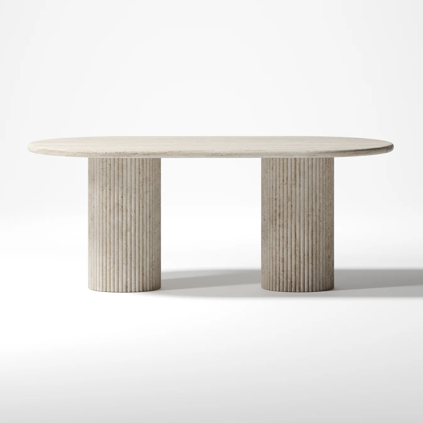Sculptural, grounded, and enduring—the Heiwa Dining Table is a true centrepiece. Its elongated pill-shaped top, carved from Travertine or Calacatta Viola marble, rests upon two fluted cylindrical bases that echo classic architecture with a contemporary touch.