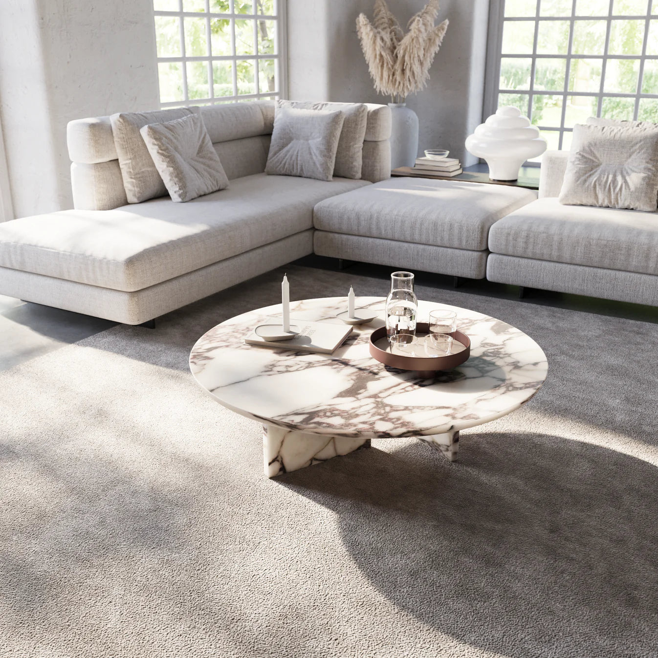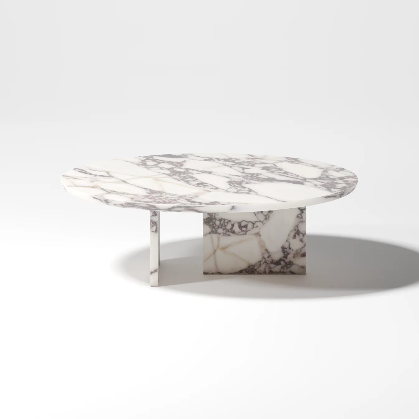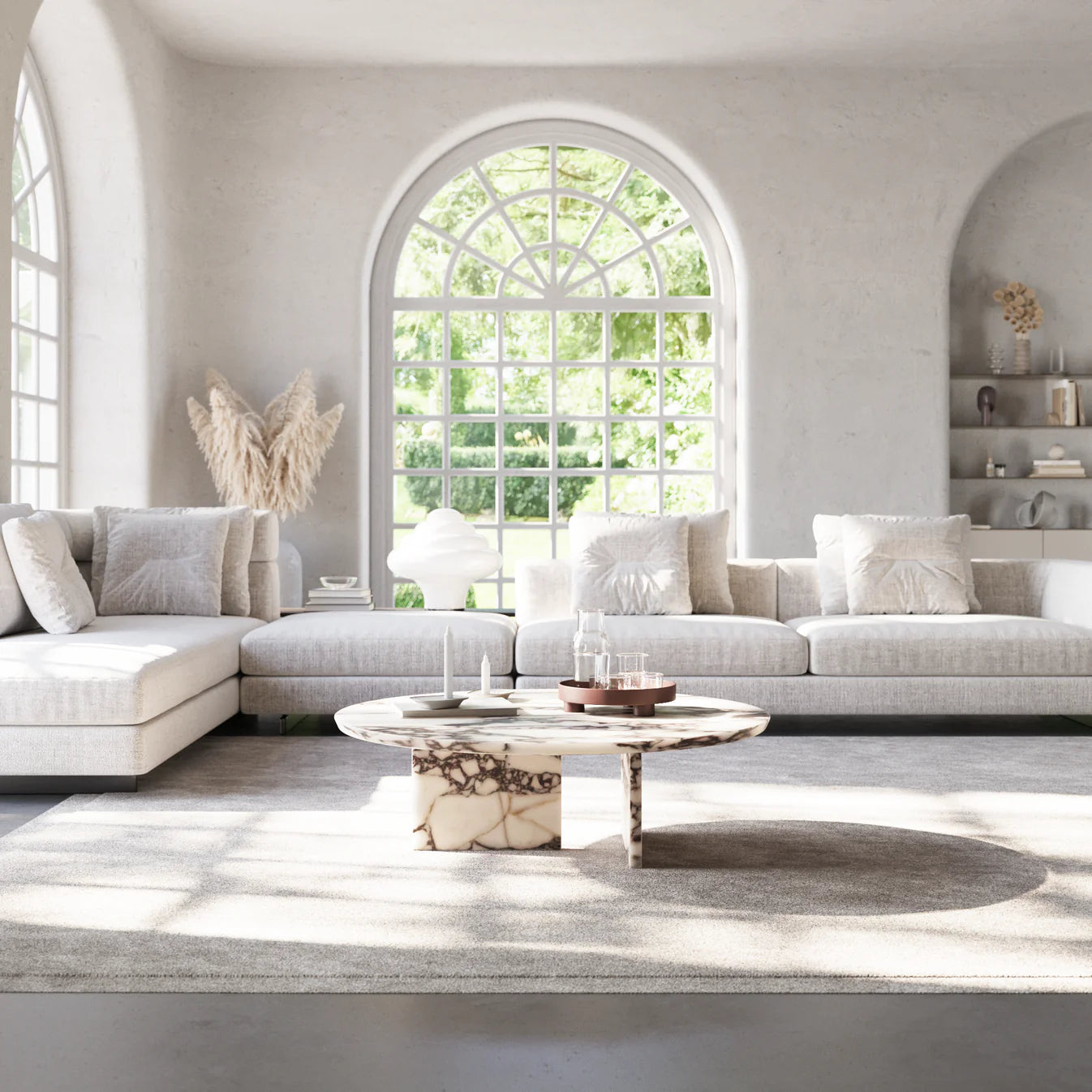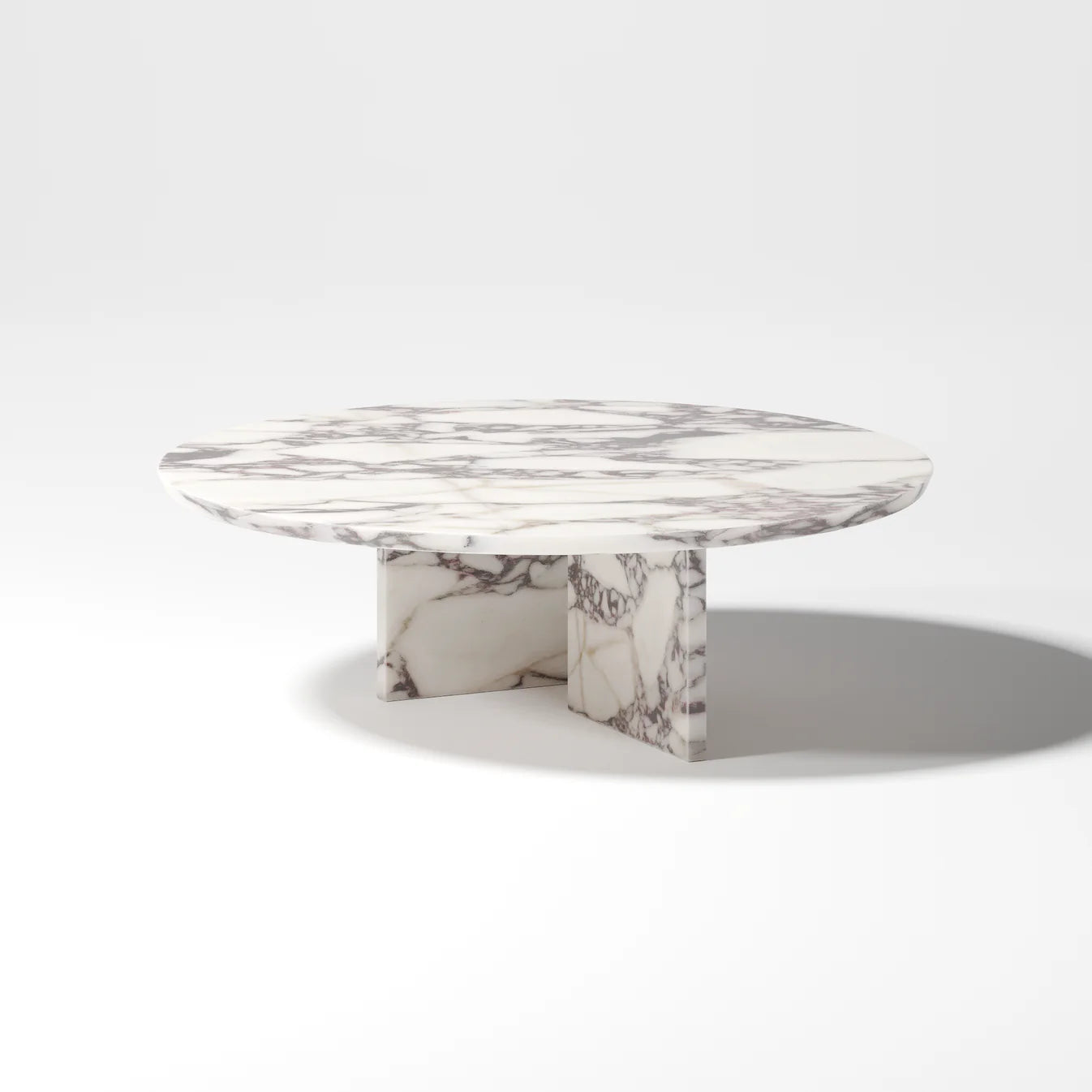 The Nova Coffee Table is a sculptural centrepiece that brings softness and strength into balance. Its round tabletop, carved from your choice of Travertine or Marble, rests on a bold T-shaped base—combining simplicity with architectural depth.