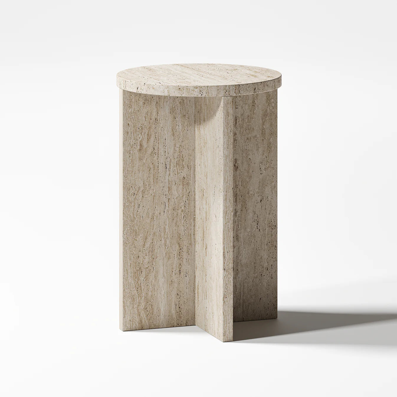 A soft balance of form and contrast, the Ria Side Table features a circular top carved from marble or travertine—each stone surface revealing nature’s quiet complexity in veining and tone. Its refined silhouette rests atop slender criss-cross legs, offering a subtle interplay of structure and softness.