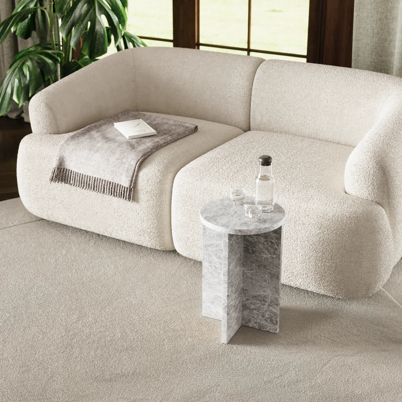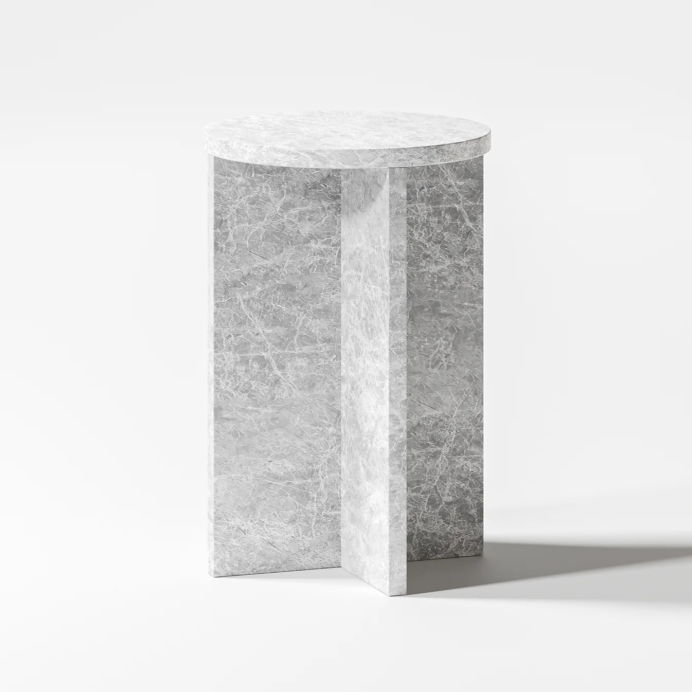 A soft balance of form and contrast, the Ria Side Table features a circular top carved from marble or travertine—each stone surface revealing nature’s quiet complexity in veining and tone. Its refined silhouette rests atop slender criss-cross legs, offering a subtle interplay of structure and softness.