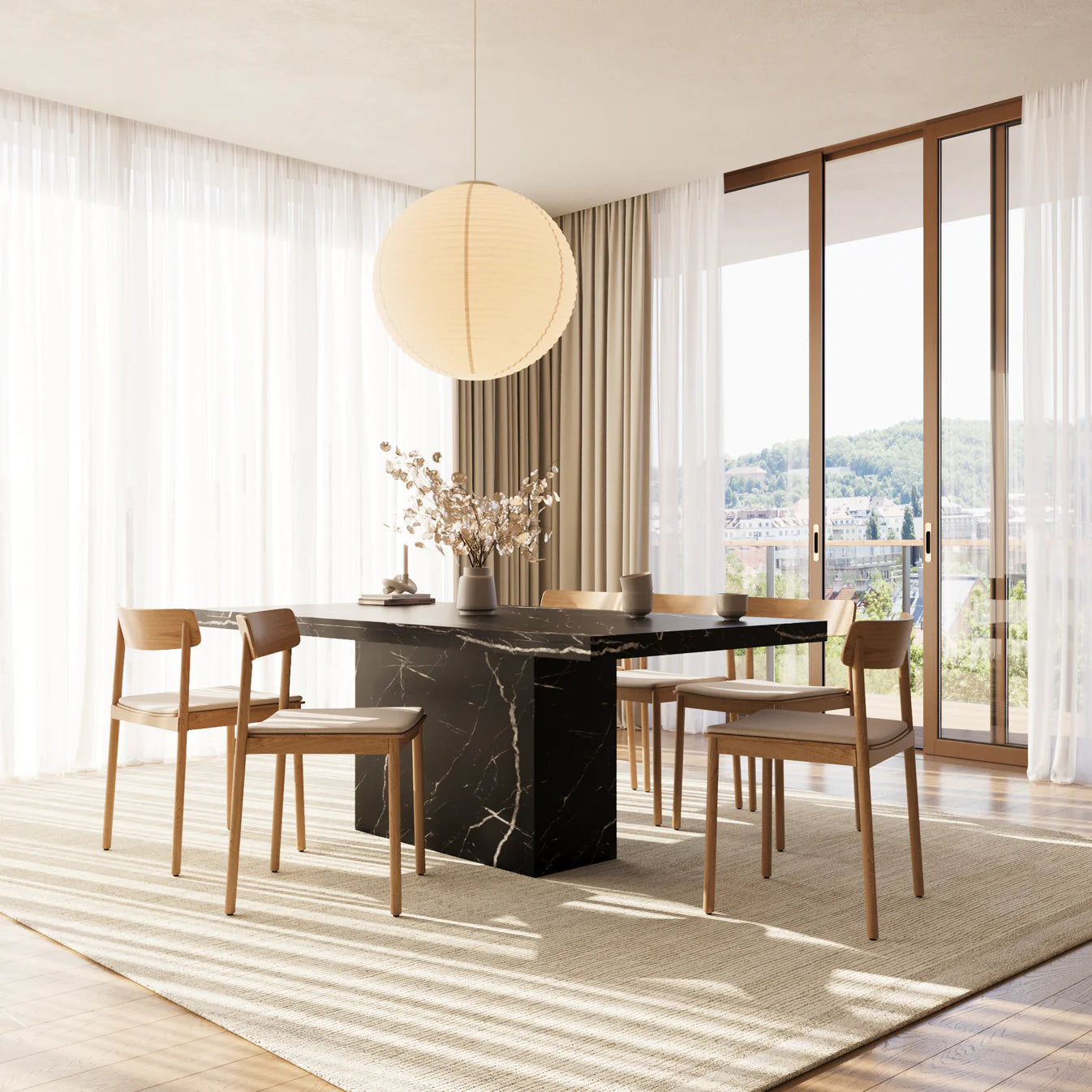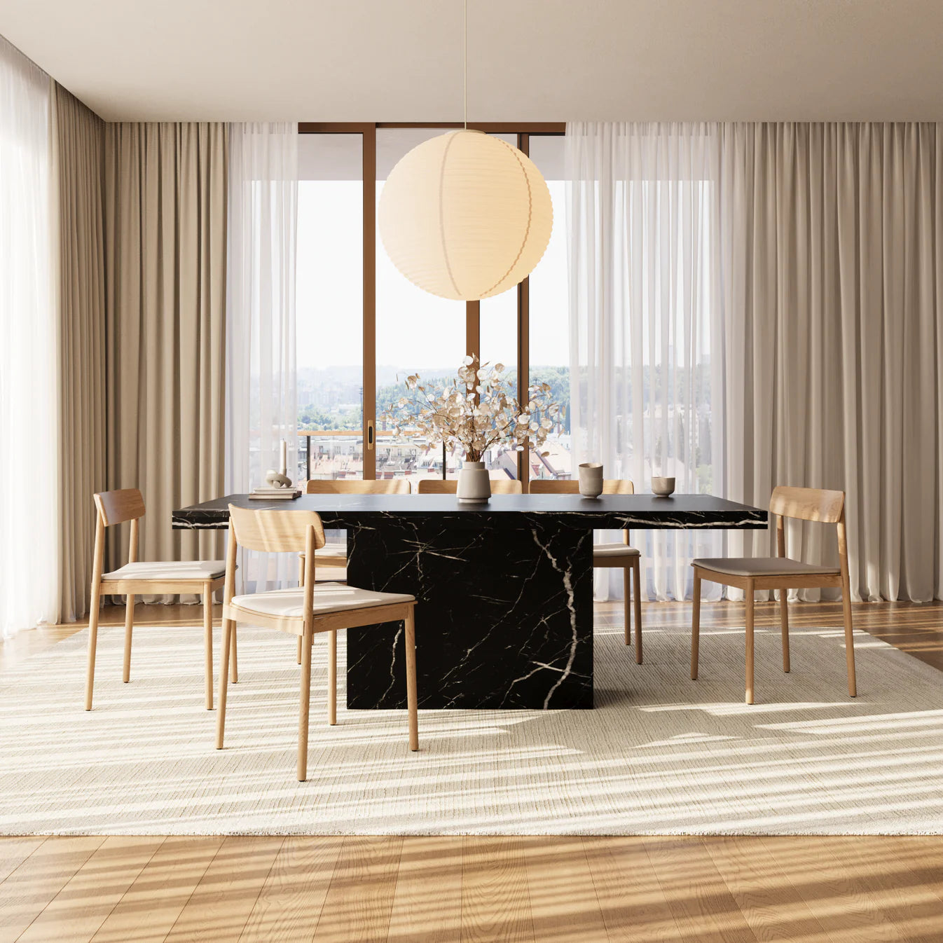 A bold presence with refined simplicity, the Venux Dining Table is designed to ground your dining space with timeless strength. Its rectangular stone top—available in Travertine or Marble—rests on a solid, monolithic base, offering a harmonious balance of form and function.