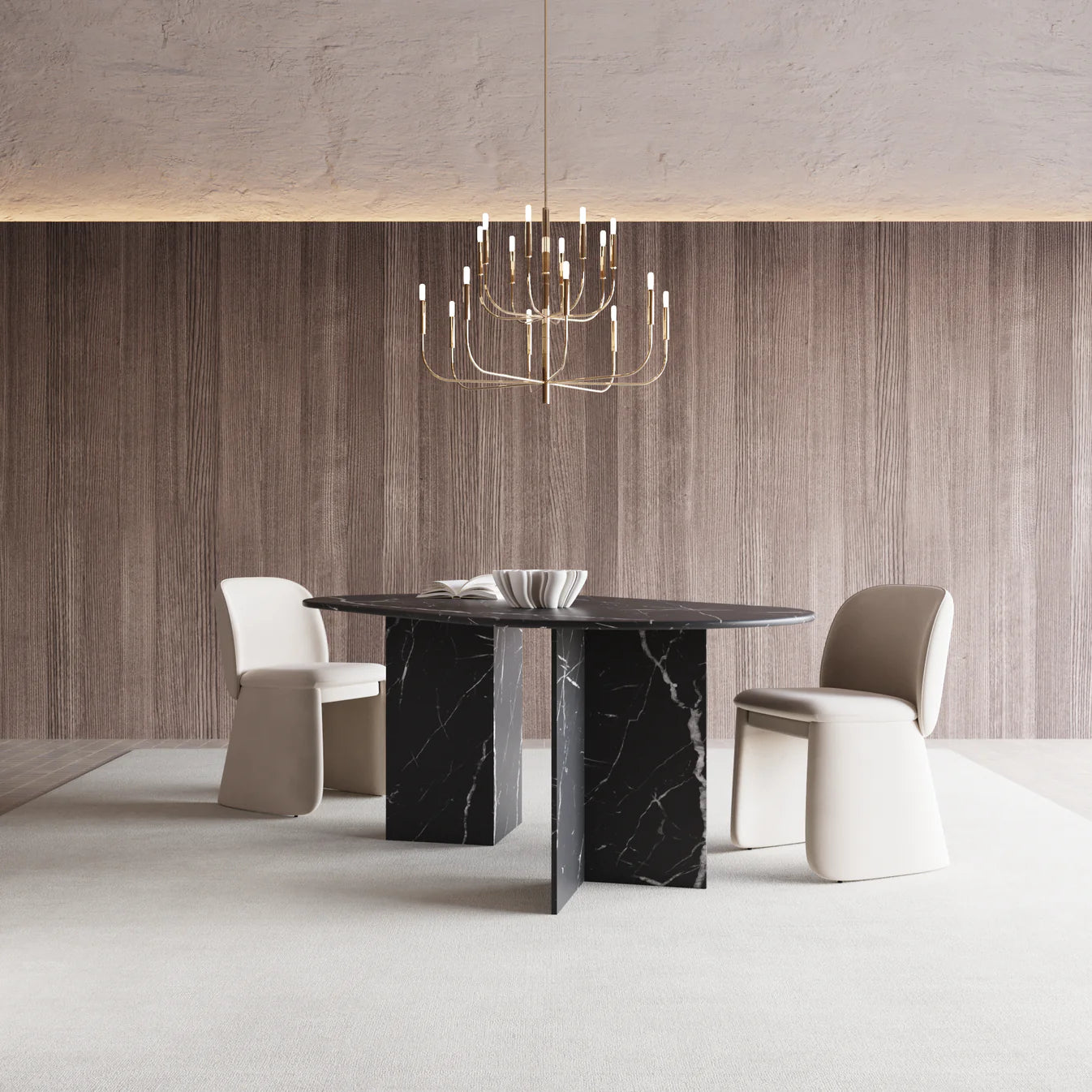 With its pill-shaped top and sculptural V-shaped legs, the Verve Dining Table is a study in balance—elegant, expressive, and quietly commanding. Crafted from your choice of Travertine or Marble, each table showcases the natural artistry of stone through rich veining and subtle tonal shifts.