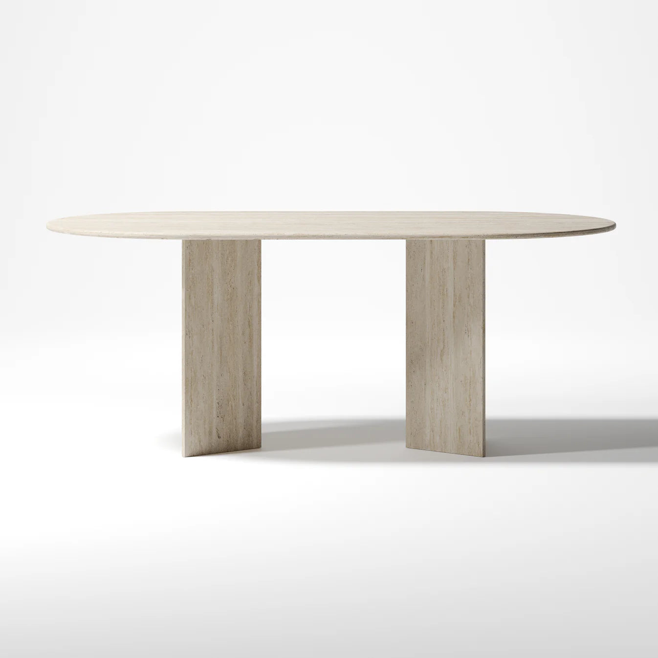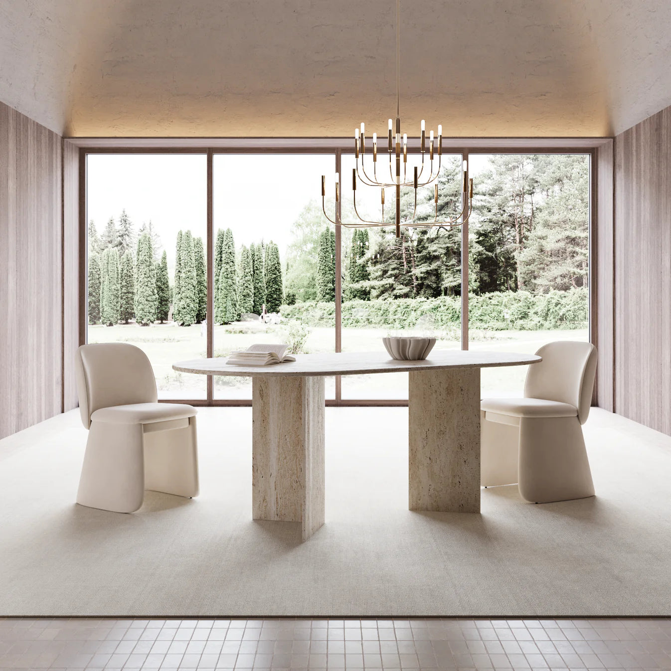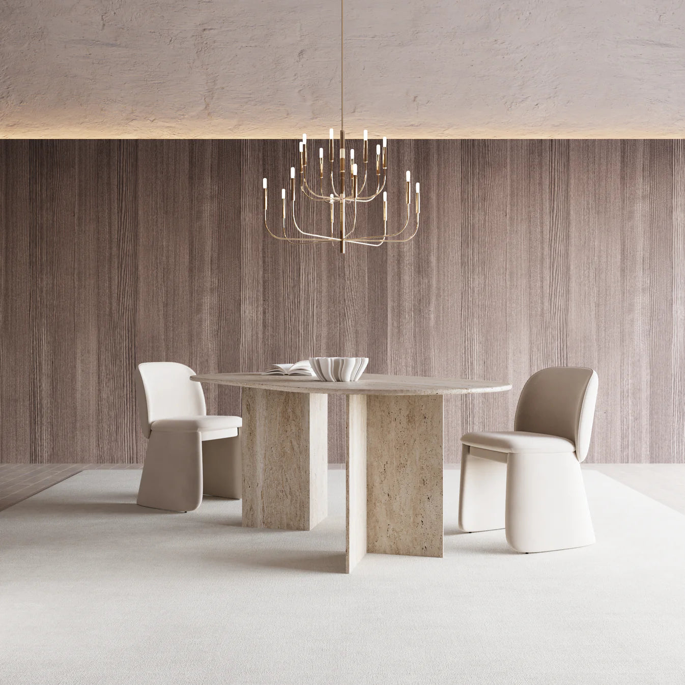 With its pill-shaped top and sculptural V-shaped legs, the Verve Dining Table is a study in balance—elegant, expressive, and quietly commanding. Crafted from your choice of Travertine or Marble, each table showcases the natural artistry of stone through rich veining and subtle tonal shifts.
